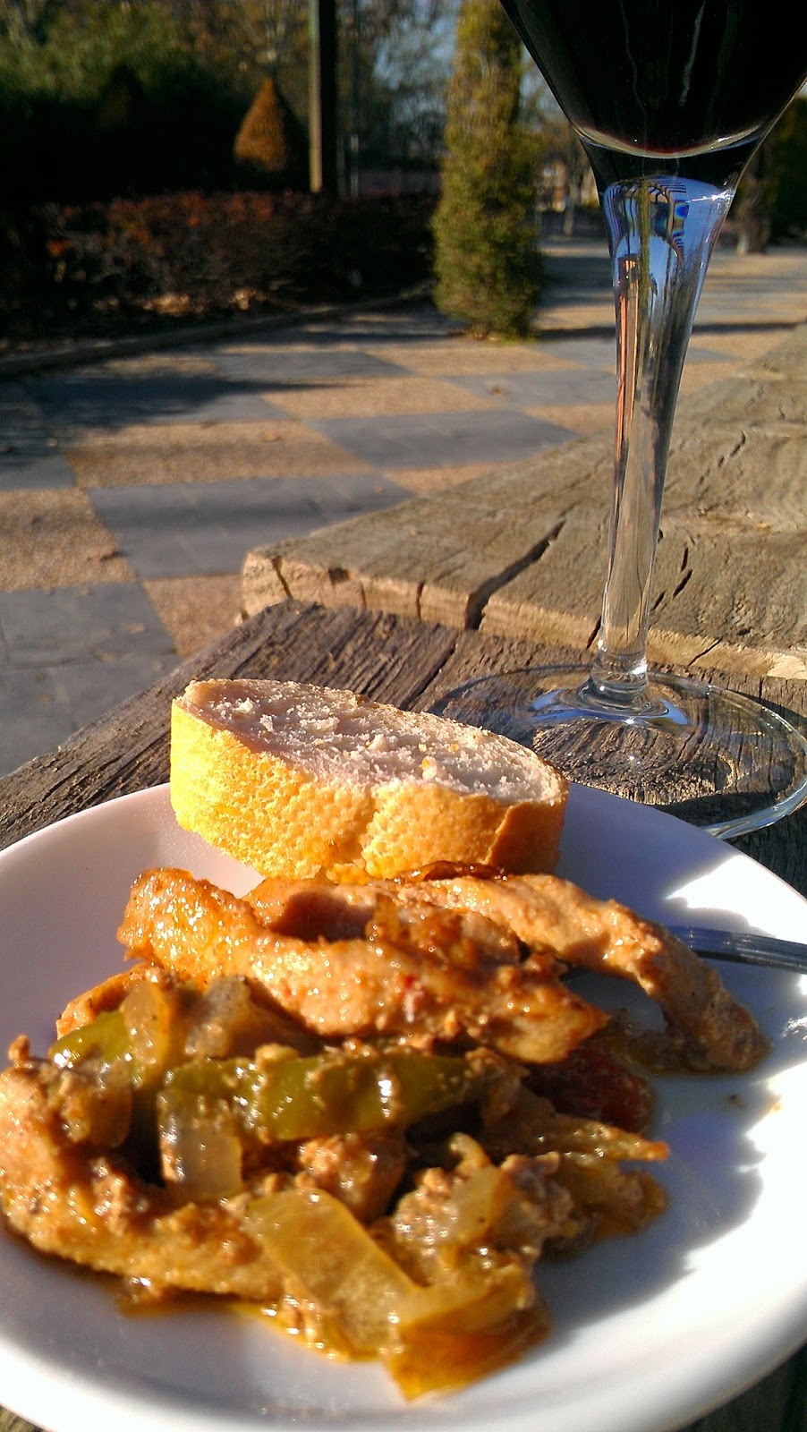 I decided to order a second glass… you know, for research purposes. This glass was accompanied by a decent portion of deep fried chicken strips that had a slight coconut flavor and a little bit of a balsamic glaze drizzled on the plate. With the unseasonably warm weather, the mild taste of coconut seemed just right, and, for a moment I imagined that I was in some more beautiful, more tropical location than a park on the south side of Ciudad Real.